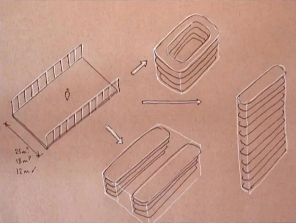 通过采光模拟优化为弧形的建筑并不能高效利用长方形地形面积,随后又设计为蜿蜒起伏的建筑形状