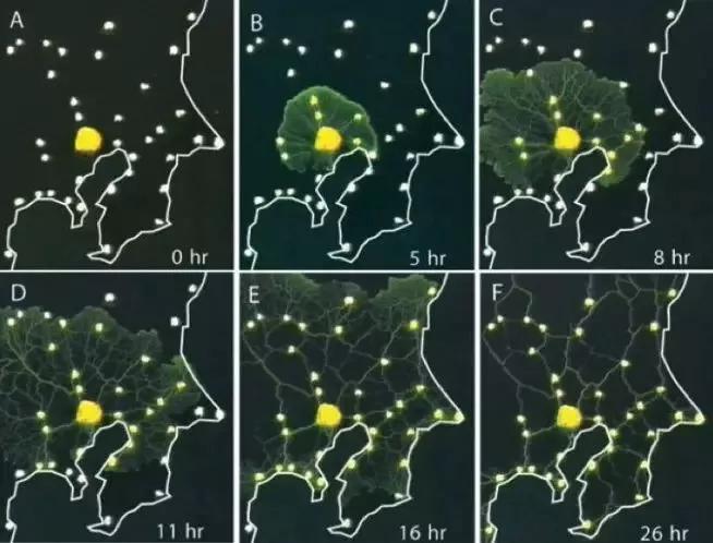 黏菌扩展的速度相当迅速。它很快找到了所有食物源,然后开始优化食物源之间的连接。这个环节结束后,呈现出的网络与日本该地域的铁路线路完全重合。铁路工程师在设计铁路网时花费了成千上万个小时才实现了这种最佳设计,而黏菌只花了26个小时。如果我们能进一步了解黏菌的原理,物流、交通系统和城市会有望更加便利与高效。