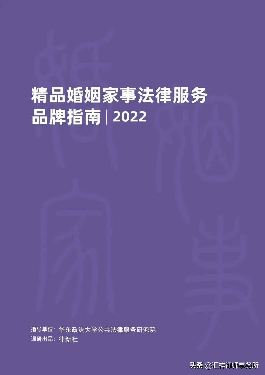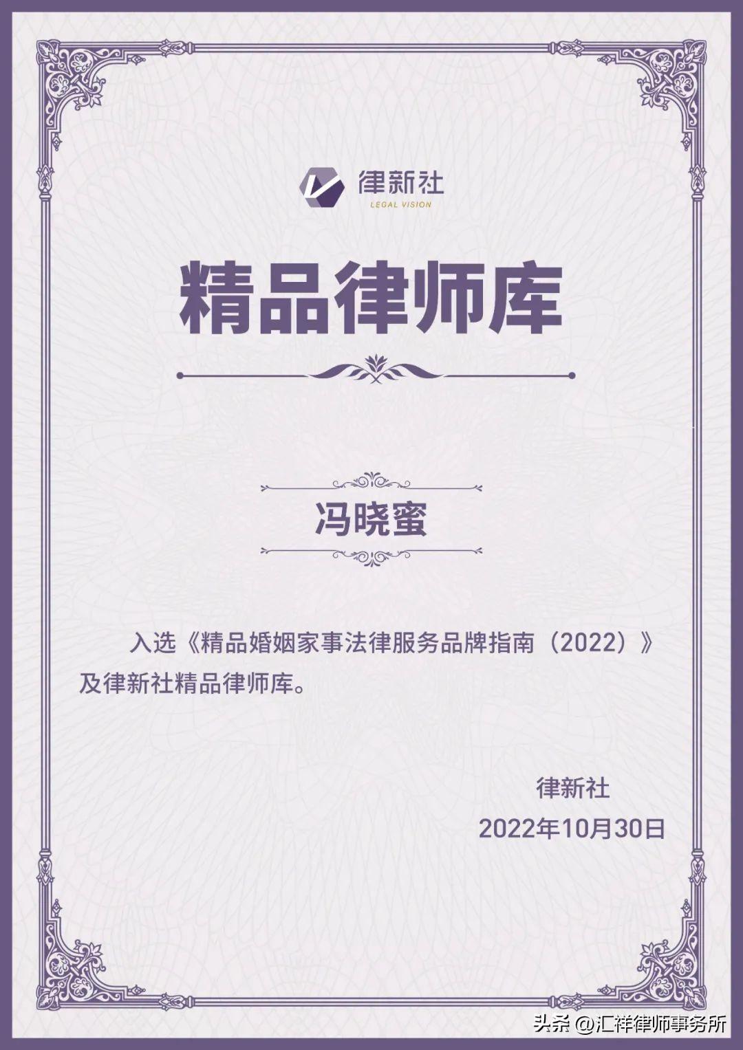北京汇祥律师事务所女工委主任、婚姻家事法律一部主任冯晓蜜律师凭借优质出色的专业服务能力和卓越丰富的法律实务经验,成功入选《精品婚姻家事法律服务品牌指南(2022)》(以下简称“《指南》”)及“律新社精品律师库”。