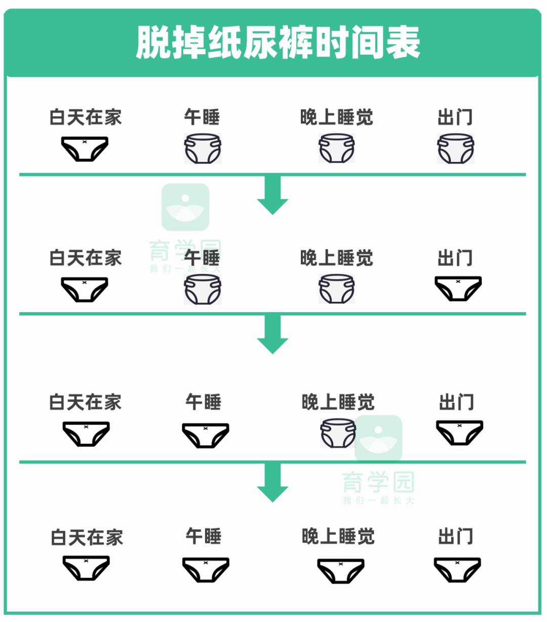 家人们别操之过急,别想着如厕训练了两礼拜就彻底告别纸尿裤。“脱”亦有道,得循序渐进地来。