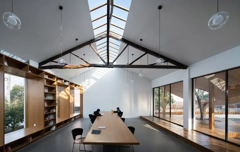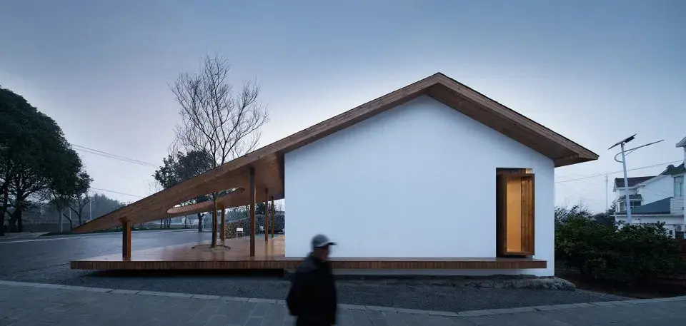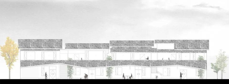 飞扬的延伸和倾斜的切角最终构建出了一个连接建筑和广场的灰空间,它延展了内外的空间,让建筑变得开放,并为村民广场的活动提供了另一个层面上的使用可能。