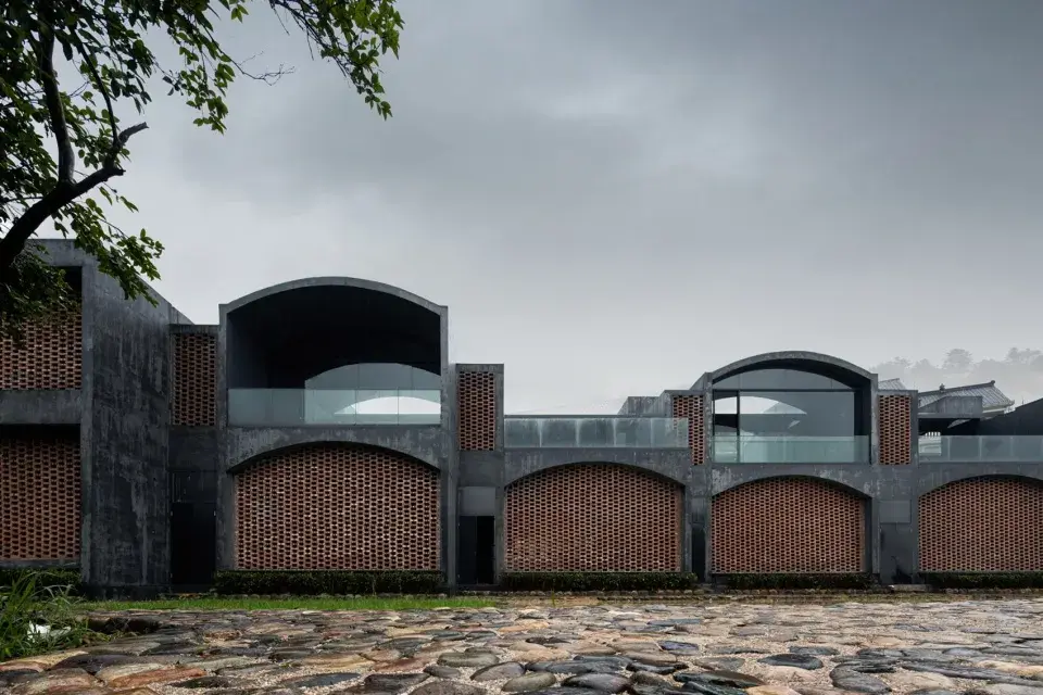 建筑形式体量和周边的民宅楼房呼应,采用混凝土建造,拱顶结构成为空间的竖向标识,在不同标高上形成逐渐退减的空间密度,设计很好的融入了本土。