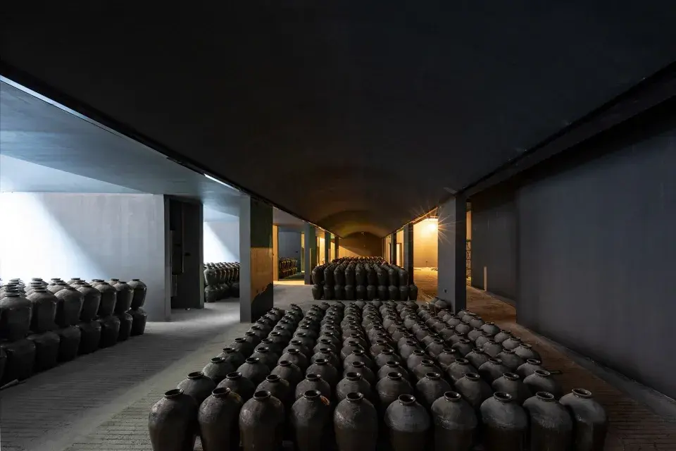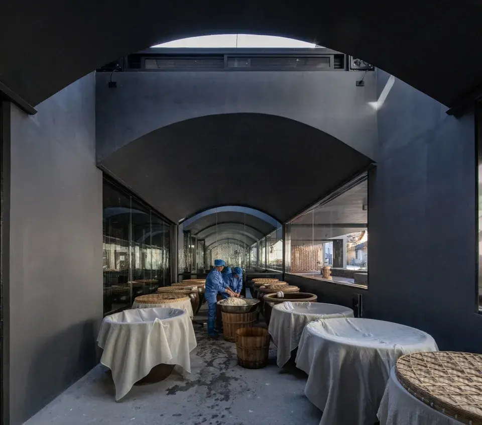 大东坝镇山头村的米酒有着悠久的历史,米酒工厂位于村口的一处下沉式场地上,地下室是封闭的酒窖,地面一层兼具生产和参观需求,二层则是开放的平台。