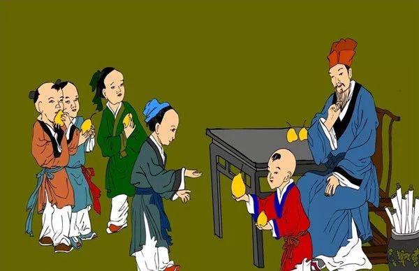 孔融小时候,父亲的朋友带了一盘梨子,给孔融兄弟们吃。父亲吩咐孔融分梨,孔融挑了一个最小的梨,其余按照长幼顺序分给兄弟。孔融说:“我年纪小,应该吃小梨,大梨该给哥哥们。”父亲听后十分惊喜,又问:“那弟弟比你小啊?”孔融说:“因为弟弟比我小,所以我也应该让着他。”