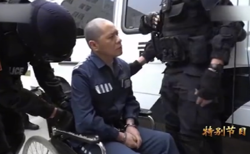 随着车门打开,一名身着囚服,戴着手铐和脚镣的男人从车上缓缓走下,见男人下车,所有记者都把手里的摄像机齐齐对准了男人。在周围特警的层层包围下,男人坐着轮椅进了医院。