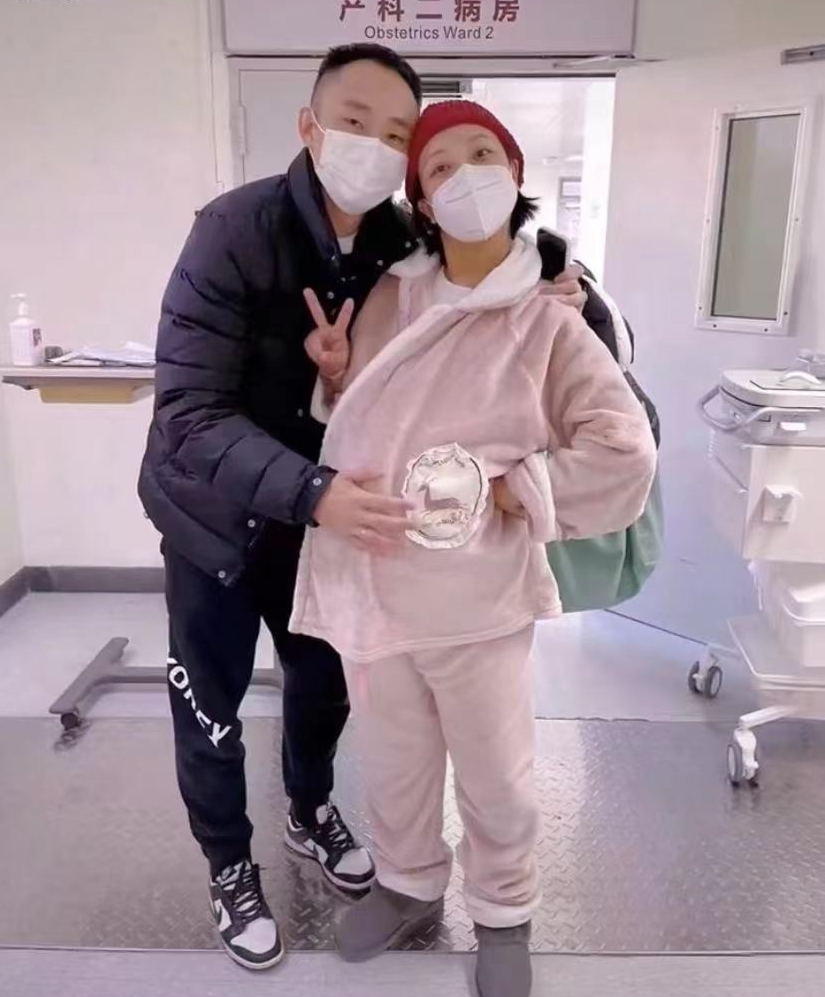杜沁怡还晒出了一张和老公在产房外的合影,她挺着大肚子叉腰比耶,老公轻抚孕肚,满眼宠溺。