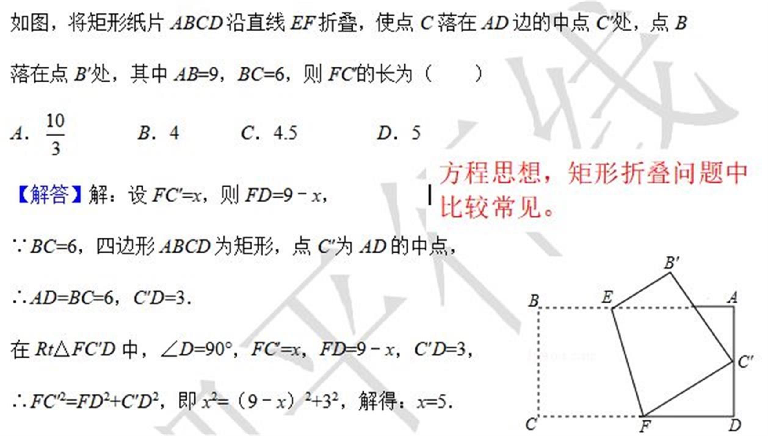 在矩形或者正方形当中,我们经常会遇到翻折问题,由于翻折前后对应图形全等,会得到很多的边相等,角相等!这时你如果去设参数,就会用一个参数表示出很多相关线段,再借助矩形中的直角,用勾股定理构造方程,解出相关线段!这是套路。