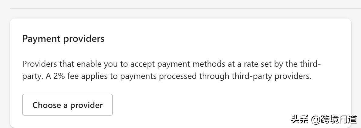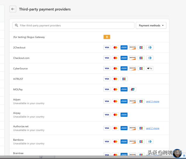 也就是第三方收款渠道,点击进去,如下图列表里面的服务商也是根据你的Shopify网站后台General的Store Address的不同而不同的。比方说,当我们网站的地址为大陆地址的时候,你在第三方信用卡收款通道可以看到Stripe是可以使用的,但是当你把网站地址改为美国地址之后,因为后台有了Shopify Payment的选项,所以在Third-Party Providers里面就无法找到Stripe的选项了。因为Shopify Payment其实就是Stripe,只不过是Shopify将Stripe集成到了自己的系统里面,起了一个新的名字。