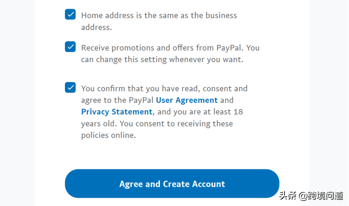 第四步、填写公司信息,所有的信息都要确保是真实、有效,公司地址要和营业执照上的一样。值得注意的是。企业和你的shopify店铺最好一致或保持相关性,因为客户在付款时也是可以看到的。最后,勾选两个PayPal条款,点击“同意并继续”,进入下一步。