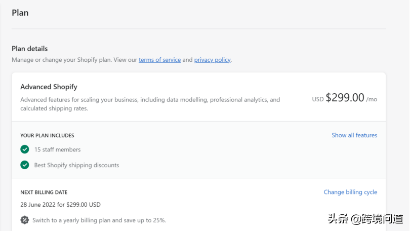 另外:套餐是可以随时进行更改的(建议大家如果钱不是很多,shopify套餐可以不用年付,你拿那些钱用在运营周转上的收益是绝对大于年付优惠的)。