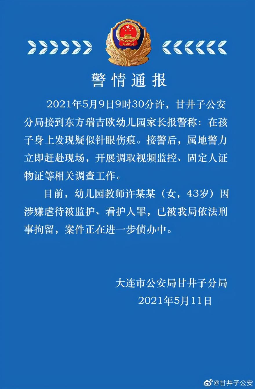 多名幼童身上疑似有针眼伤痕,警方通报 11日,辽宁省大连市公安局甘井子分局发布通报,东方瑞吉欧幼儿园家长9日报警称,在孩子身上发现疑似针眼伤痕。目前,幼儿园教师许某某因涉嫌虐待被监护、看护人罪,已被刑拘。