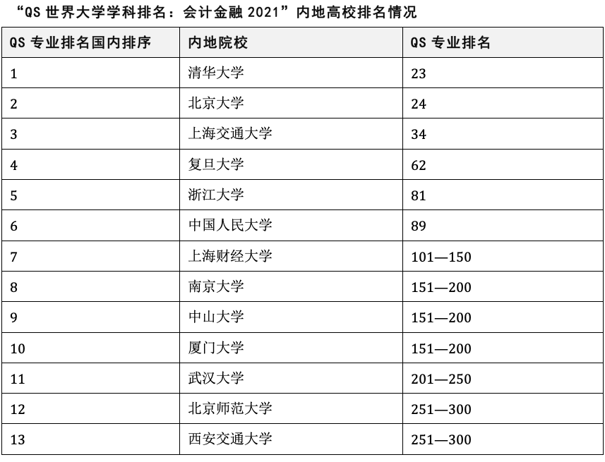 目前相关国内大学专业排名有争议,我选择“QS世界大学学科排名:会计金融2021”,锁定国内最强的会计金融名校,共有13所中国内地高校入围该专业世界前300名。