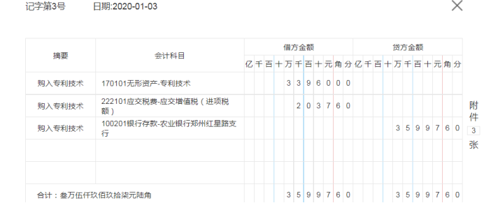 1月3日,研发中心购入实用新型的专利技术,摊销年限10年无残值,以银行存款转账支付。