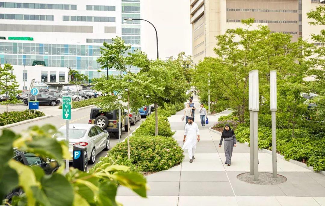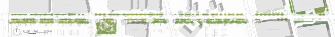 该街道强大的植被足迹,长角种植床最大限度地增加植树面积,同时尊重现有大型树木的根部区域。分层的植被系统在冷却空间时增加了渗透性。灌木层,下层植树和冠层植树是由本地和城市适应的物种组成的,对布法罗的严冬和盐渍制度具有高度的耐受性。