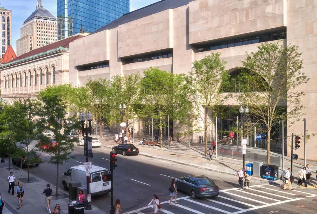 菲利普·约翰逊1972年扩建的图书馆建立了一个内向的建筑,最着名的改造功能是删除2000磅的石碑。建筑师在街头的窗户前面,筛选交通和超越城市的景色。许多被删除的平板电脑现在重新用作人行道摊铺机向下延伸Boylston街在图书馆前面。附加的景观建筑元素包括十六条成熟的街道树,悬链线照明系统和各种有吸引力的街道家具,包括一个27英尺公民桌,配备了电源和wifi。