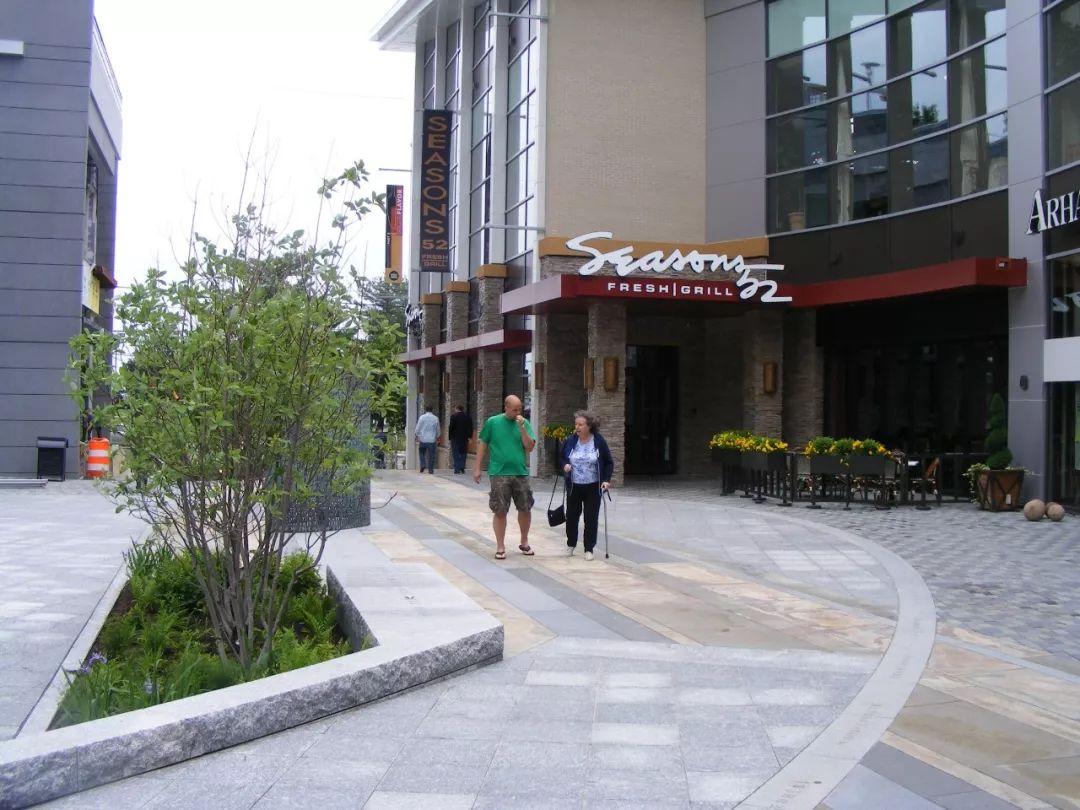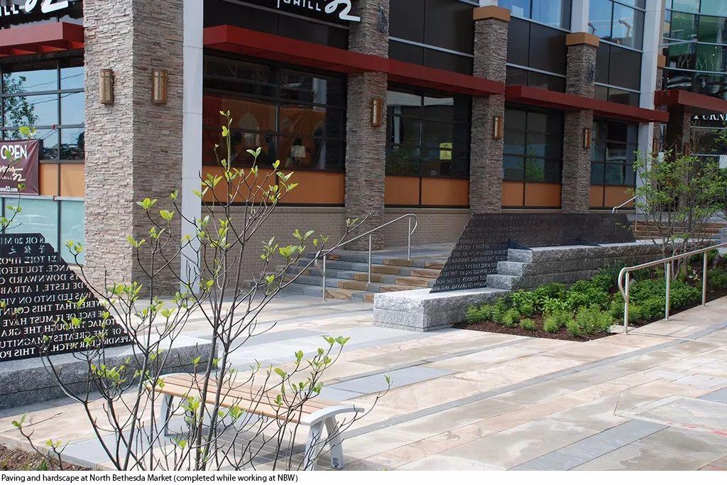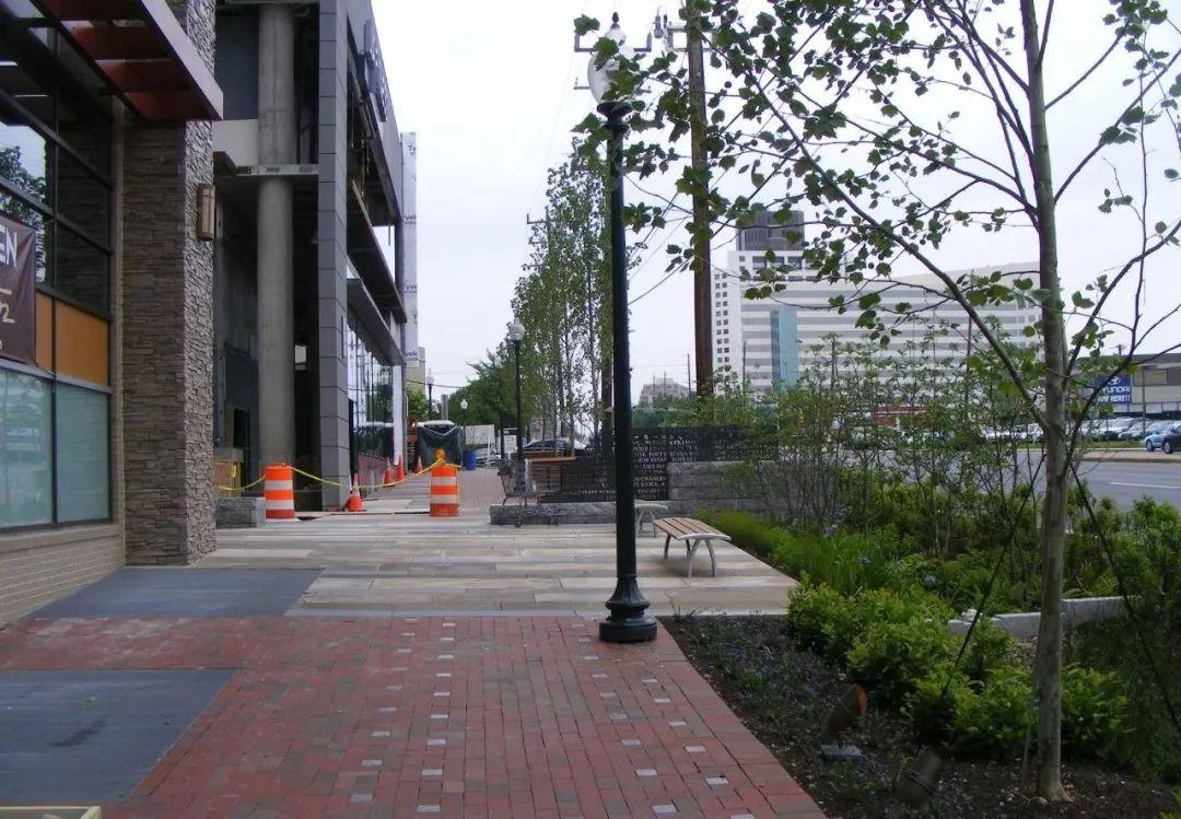 纳尔逊·伯德·沃尔茨(Nelson Byrd Woltz)设计了与该项目相关的所有公共室外空间,包括中央广场,户外市场的节日街道和项目周边的街景。该设计采用当地地理,地质和生态学的线索。靠近地理秋季线,广场中心的喷泉通过模仿瀑布引用这个接近。条纹石铺路是对该地区典型的沉积基岩的抽象概念,也是该地块的基础。Sweetbay玉兰沼泽是一个不寻常的生态社区,只在这个地区发现;广场上的种植参考了这个独特的生态系统。此外,NBW与艺术家Jim Sanborn合作,创建了一个专门针对当地文化自然和文化历史的铜和石雕专门安装。