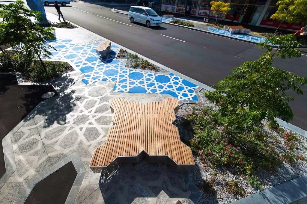马扎沙里夫清真寺(即蓝色清真寺)中精妙绝伦的花砖拼贴是设计主要的灵感来源。设计团队对其的现代诠释为创造出“几何形聚会”的设计手法。街道的两边均使用细节复杂的地面铺装,使用颜色、质感以及图案来划分出主要的聚会地点。抽象的几何形状扩大形成街景元素的排布及形态,在片区的核心区域则通过叠加密集的方式着重描绘。