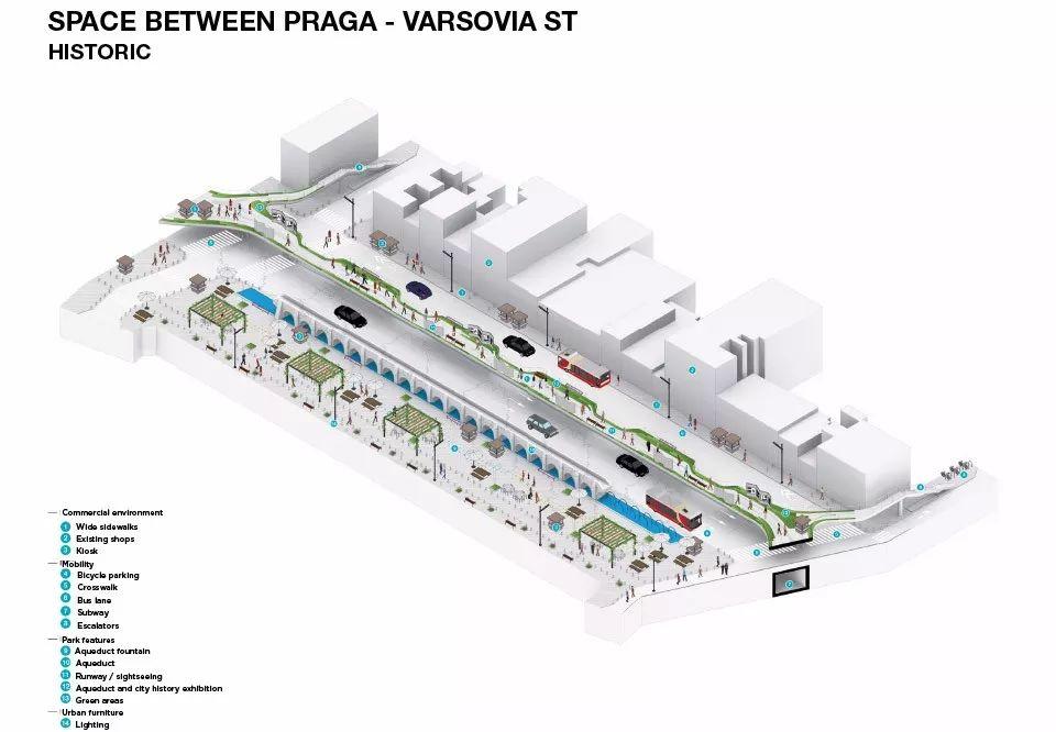 该案通过重新创造和发展公共空间获得房地产价值。规划从海滨为起点,向大街深处蔓延。支持自行车,滑轮,轮椅还有婴儿车的专用道路将建成。另外为了保证人们安全的到达中央人行道还设置了多个人行横道。最终这个企划不仅将周围更加紧密的联系,还增加了近一倍的绿地,促进了城市多样性。地面的零售区和长廊被精心设计的绿化装点,为公众提供绿荫,缓解城市绿岛效应。公园收集雨水来灌溉植物。此外公园还设置了太阳能电池板为基础耗电功能。建筑师认为这个融合了高架公园的新公共空间具有极高的品质。
