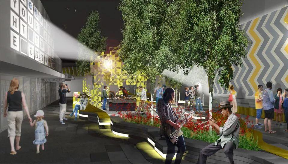 与社区及利益相关方的沟通是Morgan Court设计方案的关键所在。在沟通的过程中,人们的关注点也发生了改变。如何使Morgan Court恢复活力?如何对该商业区进行整体而有效的规划,从而增强Morgan Court的社区价值?方案中包含了一些简单却大胆的设施,以促进展览、表演和艺术活动的不断更新,鼓励人们在Morgan Court中漫步,度过美好的时光,同时也为一些娱乐活动提供机会,吸引更多人前来参观游玩。