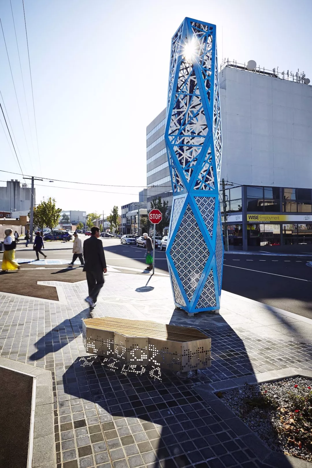 由阿富汗裔澳大利亚艺术Aslam Akram创造的装置艺术“灯”,不论在白天还是晚上,均为整个片区最重要的艺术品。“灯”的底座展现了人类的力量、知识和智慧经验,同时还展现了圣所、历史及阿富汗裔澳大利亚人的记忆。而上半部分则为金银细丝工艺制作的金属片,代表了人类力量集合的成果以及澳大利亚社区之间,多元文化之间的友谊与互敬。