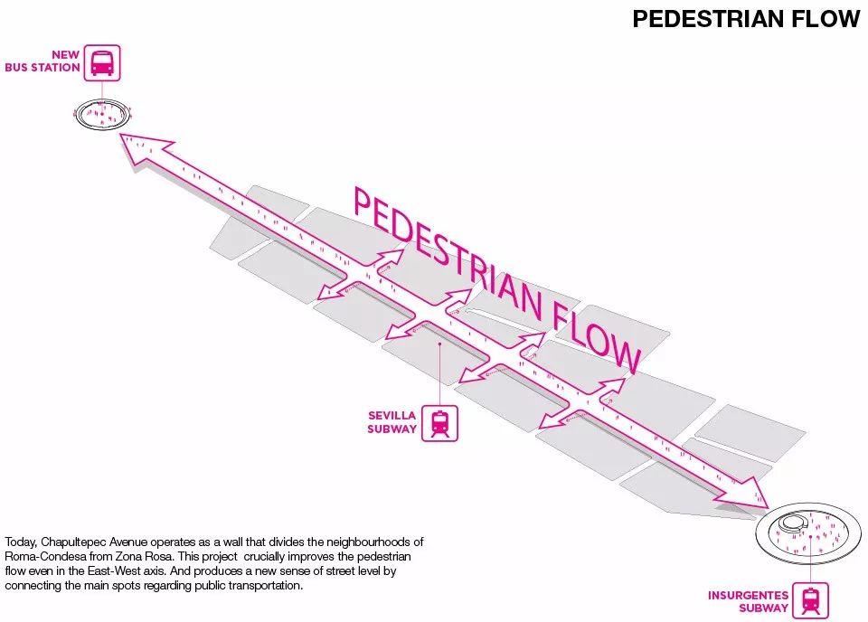 墨西哥查普尔特佩克文化长廊(简称CCC)是一个针对查普尔特佩克大街的行人和可持续燃料车型景观规划建议。建筑师旨在通过创造公园,为居民提供温文尔雅的空间,让他们感受到绿地对城市来讲有多么重要。整个规划将1.3公里长的街道彻底改造,将车道推向两侧,植入新公交车道,得以扩大市民活动空间,改造后的最大宽度达到57米。