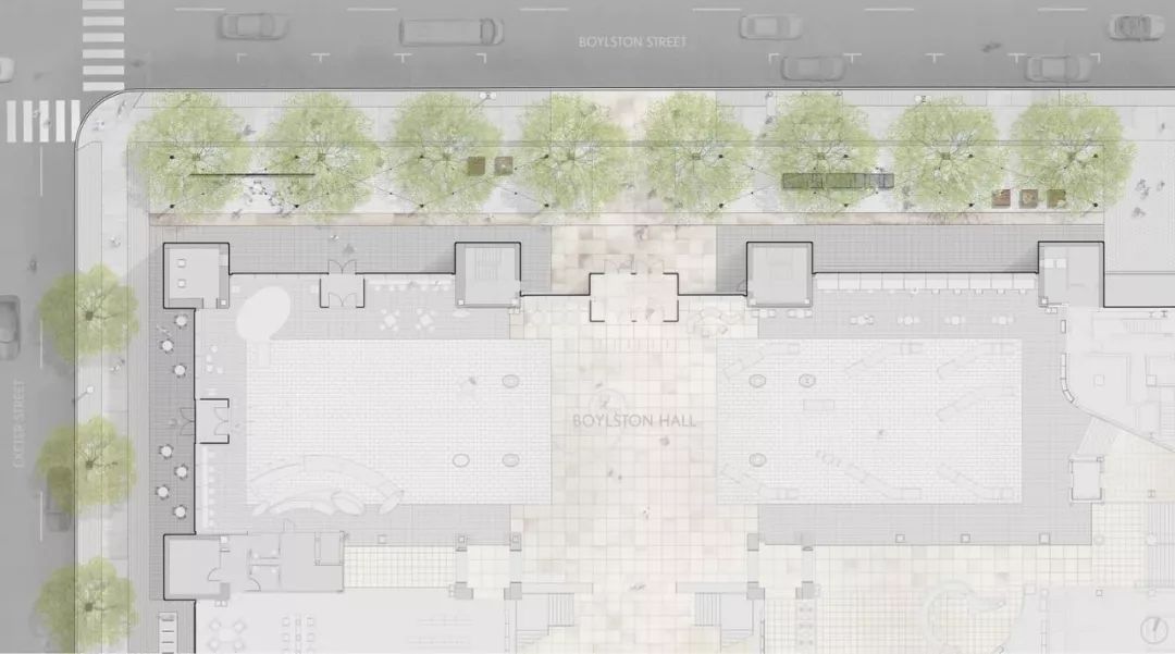 Boylston和Exeter Streets的新公共空间延伸了图书馆的大厅,为菲利普·约翰逊1972年的中央分行扩建建立了一个公民存在 - 这是建筑师William Rawn改造的建筑物的一个特色。