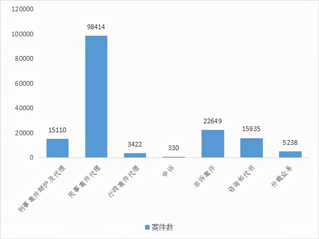 在律师办理的117276件诉讼案件中,刑事案件辩护及代理15110件,占诉讼案件的12.88%;民事案件代理98414件,占诉讼案件的83.92%;行政案件代理3422件,占诉讼案件的2.92%,代理申诉330件,占诉讼案件的0.28%。
