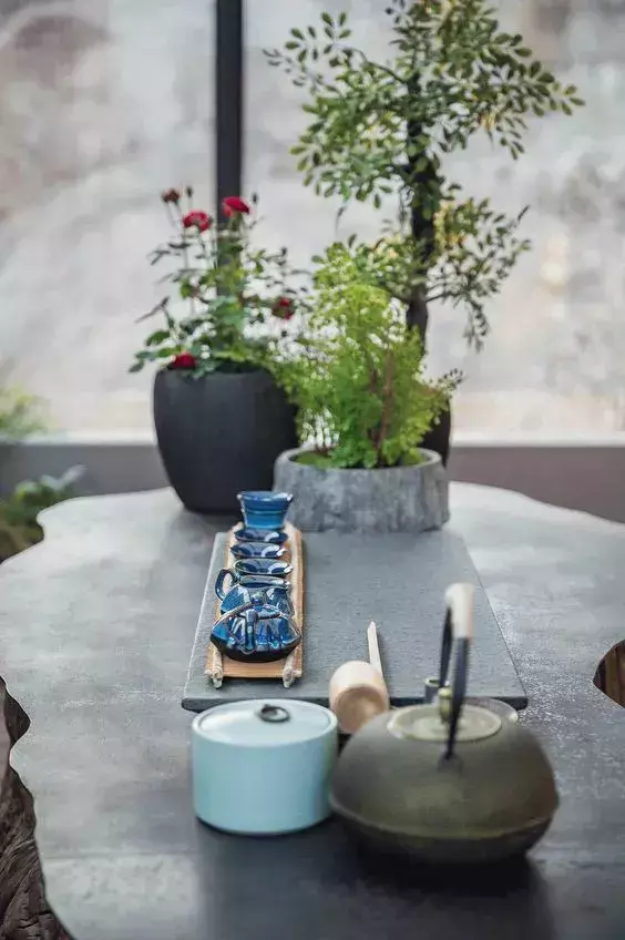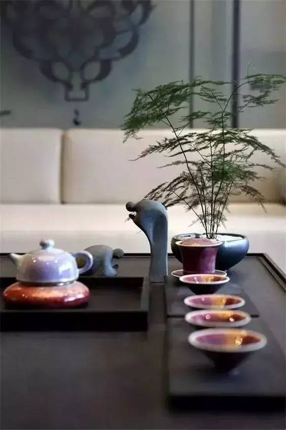 茶室贵在至简,讲求心境。所以茶室布置一般不提倡色彩鲜艳、图案繁杂。采用原木的柜体、藤竹的凳子或蒲团、素雅的桌旗、古朴的茶器……人们便能在茶香袅袅中,得到一种忘却繁事的欢愉和满足。