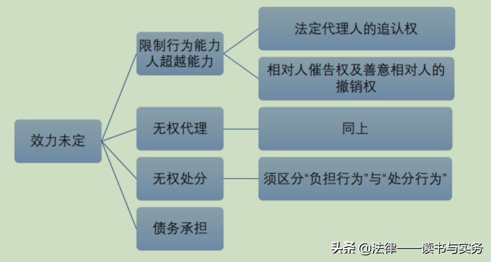 1、效力未定(待定)法律行为作出后,由于某项特别生效要件(使生效具有正当性的关键要素,通常与第三人利益攸关)不具备,未发生效力。【简而言之,效力待定民事法律行为最核心的视角即它是可以被追认其效力的行为,但在合理期限内没有通过追认或其他机制使其有效,它最终会终局性的不发生效力】