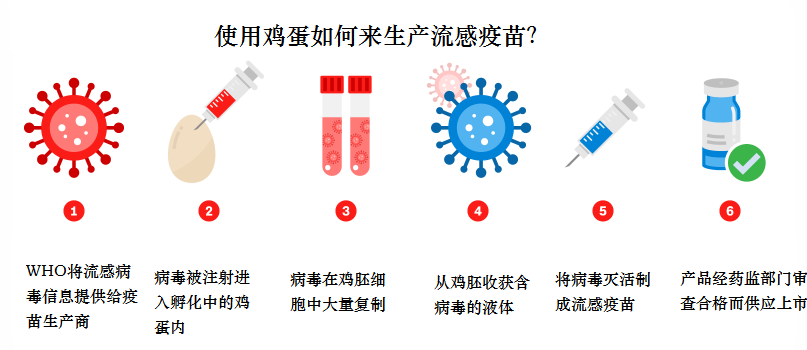 生产商收集来自鸡胚的含有大量流感病毒的液体,经过对病毒灭活,然后制成“流感病毒灭活疫苗”。