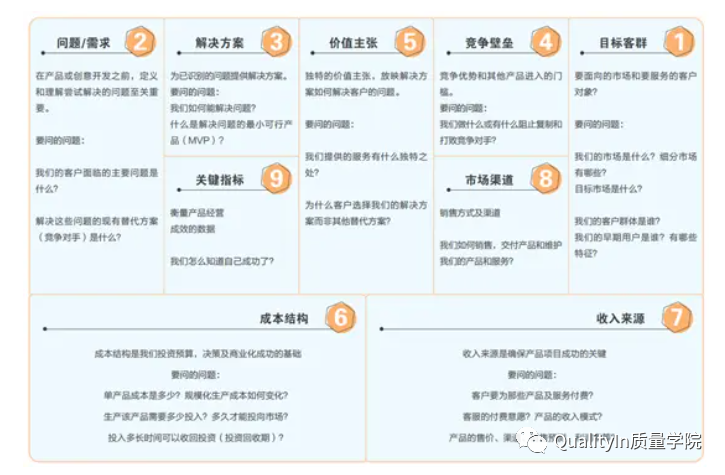 接下来,就和大家介绍一下产品画布的使用方法。产品画布由9个方面构成的,这9个方面在分析的时候,也是有流程和顺序的。接下按照流程逐一讲解下。