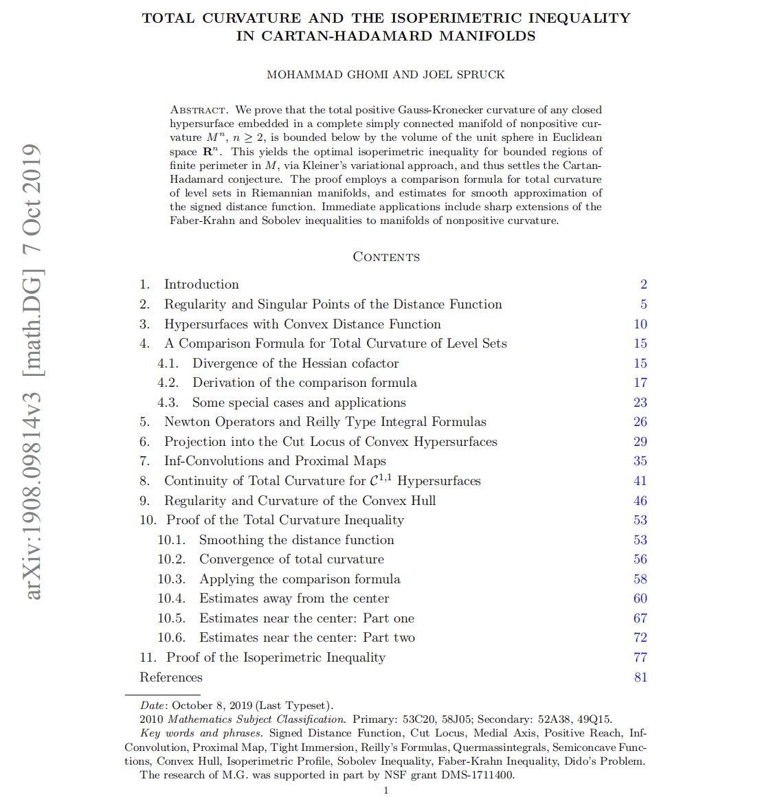 最终,在不久前的2019年10月份,两位美国数学家Ghomi和Spruck利用Kleiner的思想,将问题简化到具有一定光滑性(使得曲面的曲率可以定义)的凸曲面上,通过估计高斯曲率在曲面上的面积分(一般称为曲面的全曲率),最终彻底完成了等周不等式的证明,等周不等式的深刻性也因此更上一层楼。