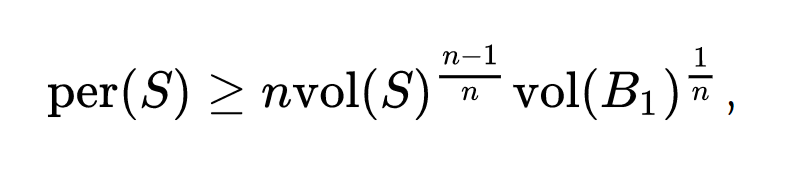 其中per代表区域的表面积,vol代表区域体积,n是空间维数。特别的,vol(B1)是半径为1的单位球体积,且取等条件与平面时一样,也就是当且仅当区域为标准的球。