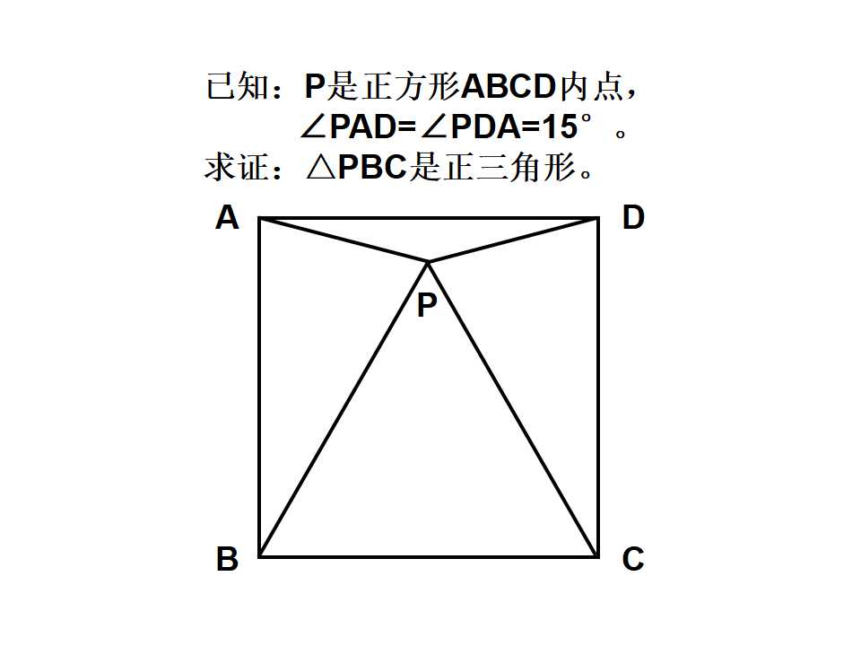 看到15°和75°,第一反应是给15°多凑15°变成30°,或者是将75°拆分成60°和15°,毕竟30°和60°更让人喜欢,加上题目是为了求证某三角形是正三角形,跟30°和60°息息相关,更加印证我的想法。