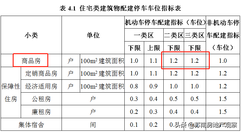 1、商品房二类、三类机动车车位下限上调至1.2