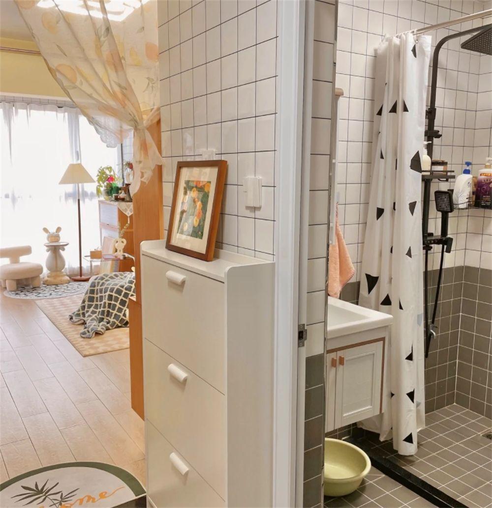 进门右手边则是卫生间,里面用浴帘做了简单的干湿分区,既节省了空间,也能一定程度上防止溅水。