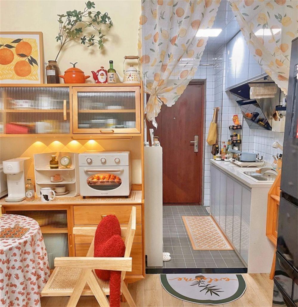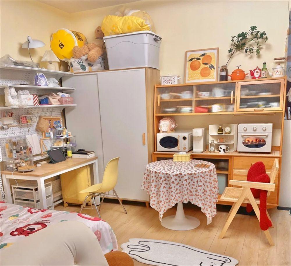 进门右手边的角落,做成了一个餐桌和工作区,餐桌区域用小书桌与餐边柜相互搭配,放上一些小厨电,也能给姑娘一个舒服的用餐区。