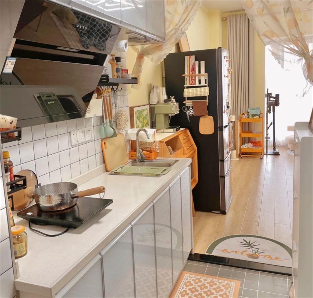 进入家中,是一条狭窄的走廊区域,虽然空间逼仄,但是光线充足,照明效果很不错,而在这条狭窄的走廊中,容纳下了玄关鞋柜和一间开放式的厨房。
