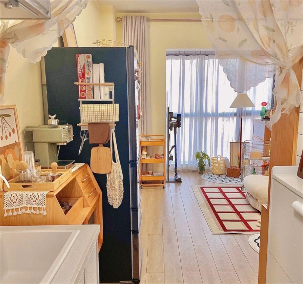再往里走,是家中的客厅卧室一体化区域,餐边柜和冰箱相连,也完美利用起了这处空间,我们就先从客厅开始说起。