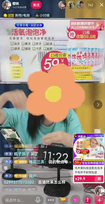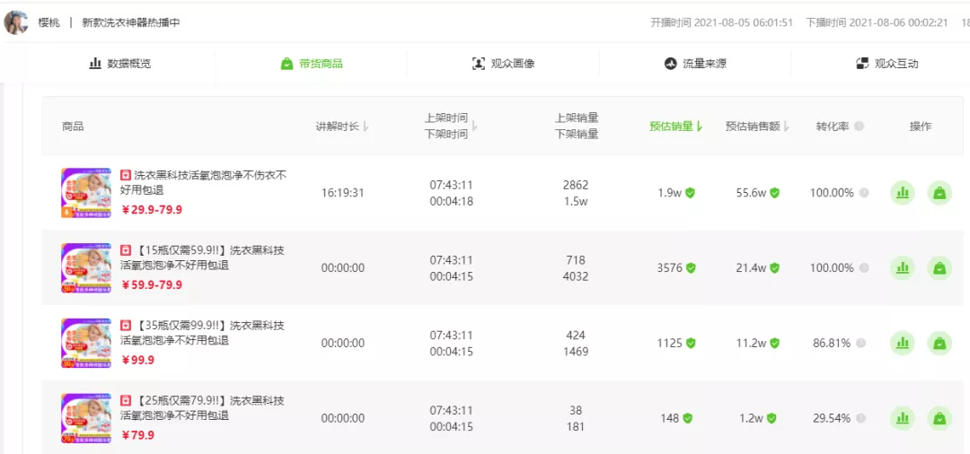 同时,我们注意到直播中,主播的讲解商品以单价最低的29.9元的“洗衣液”为主,讲解时间覆盖了正常直播。