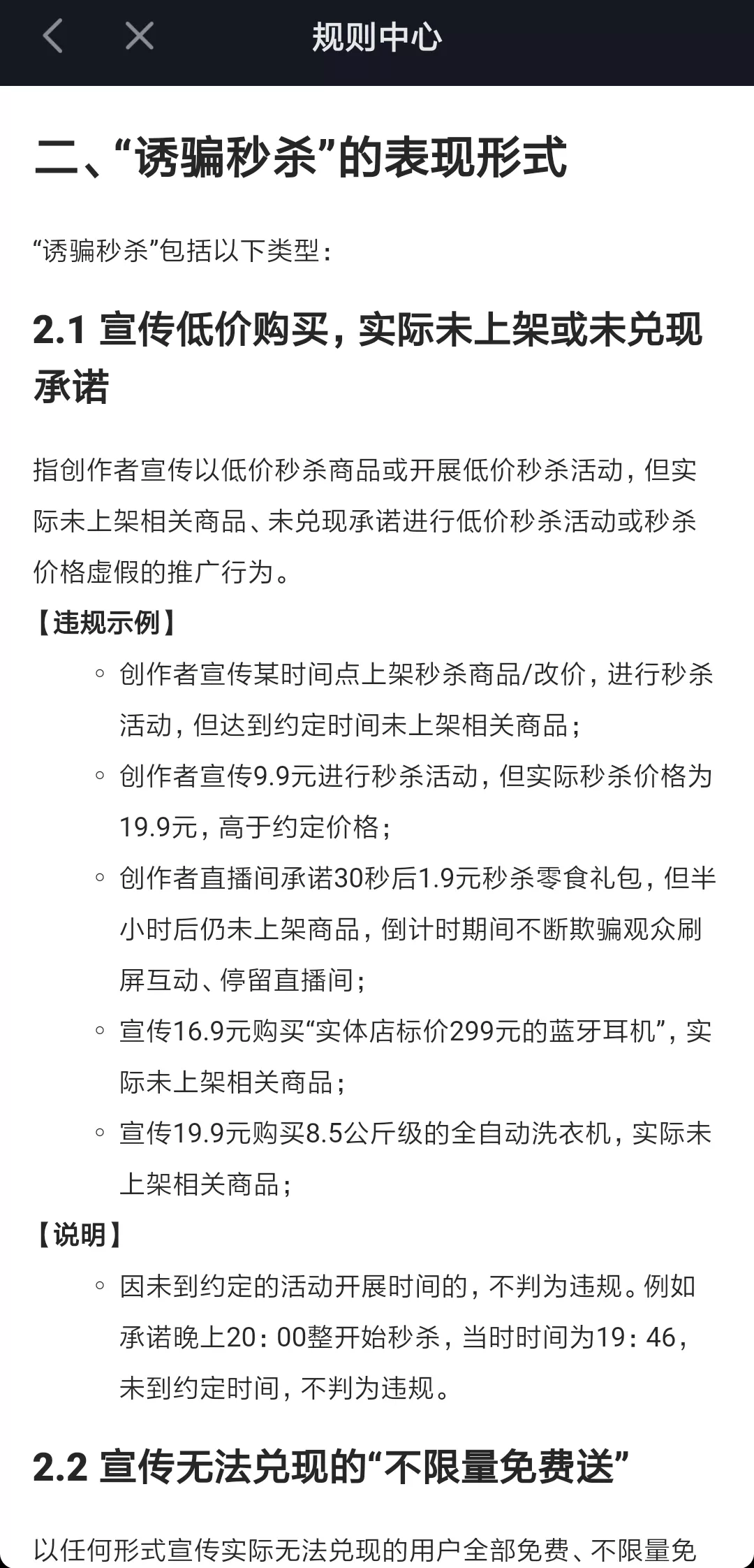 为了避免长时间憋单等恶意营销行为,上周抖音接连发布的“诱骗秒杀”、“诱导互动”的违规营销细则,禁止引导用户发布“拍了”“666”等与商品无关的弹幕;引导用户点赞XX下;秒杀信息发布不规范等违规行为。
