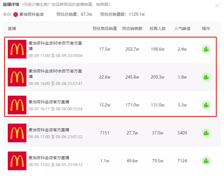 我们点击“关联直播”可以查看账号在直播数据,通过直播标题可以明显看出,在8.7官方开设了“抖金店88会员节”活动后,「麦当劳抖金店」的直播间人气和销售数据成倍提升。