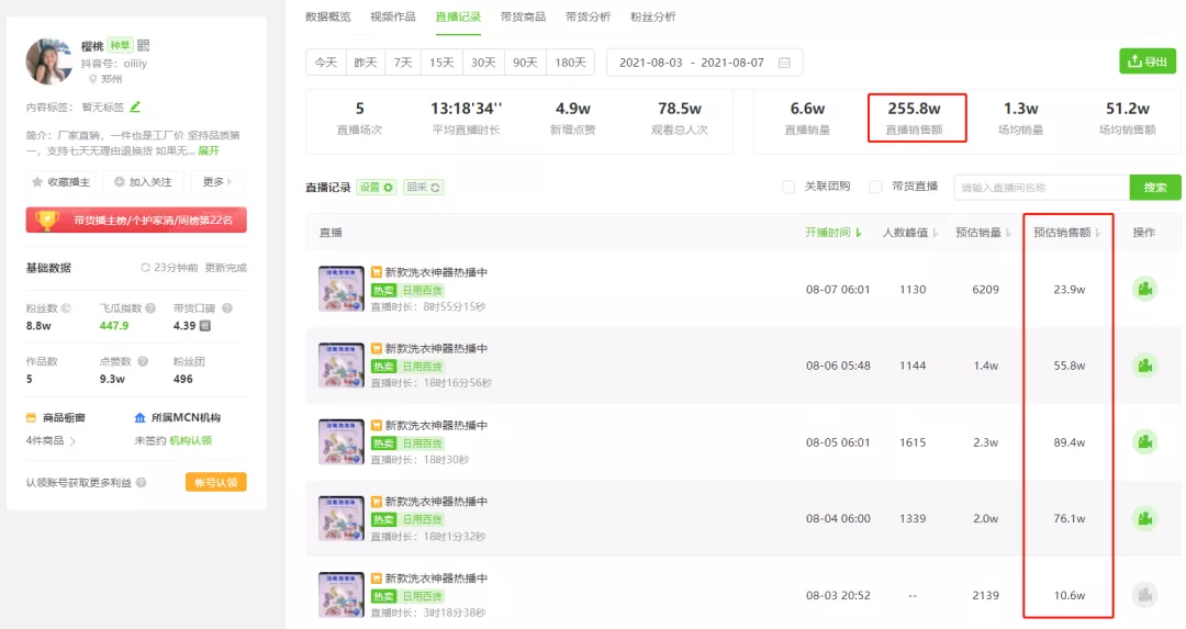 比如我们通过“实时直播热榜”,发现有个低粉黑马「樱桃」直播间,虽然在开播前只有1000+粉,但开播5场后,粉丝涨到8.8万,直播总销售额255.8万!
