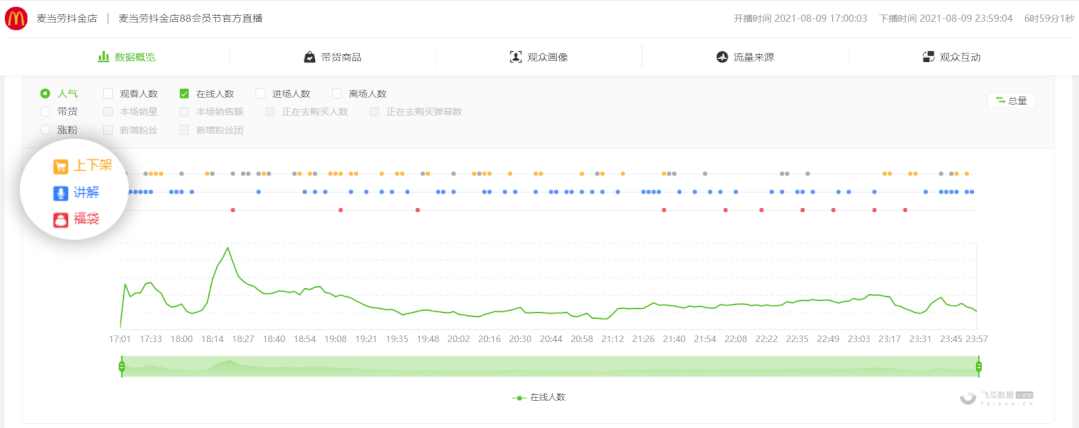 流量趋势图:直播间人气、带货、涨粉趋势图,并可同步查看商品上下架/讲解、福袋发布节点,更好判断直播运营策略;