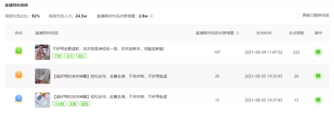 同时,我们发现「樱桃」在直播过程中,还会连续发视频为直播间带来持续的引流。视频主要是用“洗衣液轻轻一泡,就洗干净”的内容,而我们看到直播间的销售转化率高达10.14%,说明这些视频引流进直播间的观众都非常精准,在选择引流视频的时候,可以注意内容和产品的结合,能带来更精准的用户。