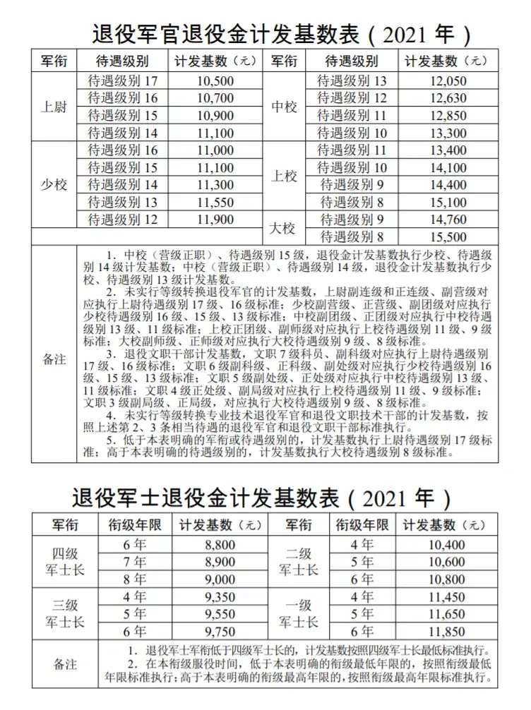 第十条 依据本办法出台当年军人工资、全国城镇单位就业人员平均工资,综合考虑军官、军士队伍建设和退役军人安置实际,确定退役金计发基数,具体标准见附表1。