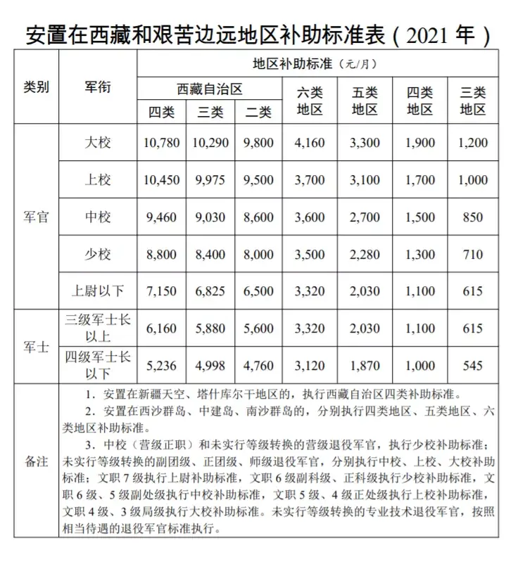 第十五条 逐月领取退役金的退役军人在西藏自治区、三类以上艰苦边远地区服役满10年,安置在上述地区,且按照规定缴纳基本养老保险费的,达到国家法定退休年龄前发给地区补助,具体标准见附表2。地区补助标准随国家艰苦边远地区津贴标准调整,其中西藏自治区补助标准按照六类艰苦边远地区津贴标准相应调整。