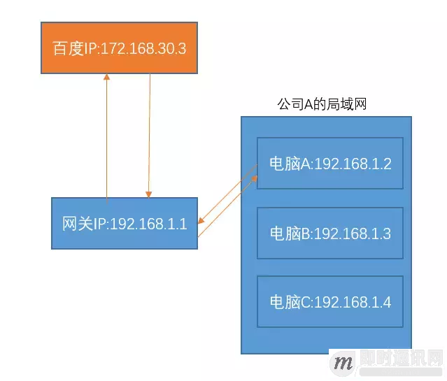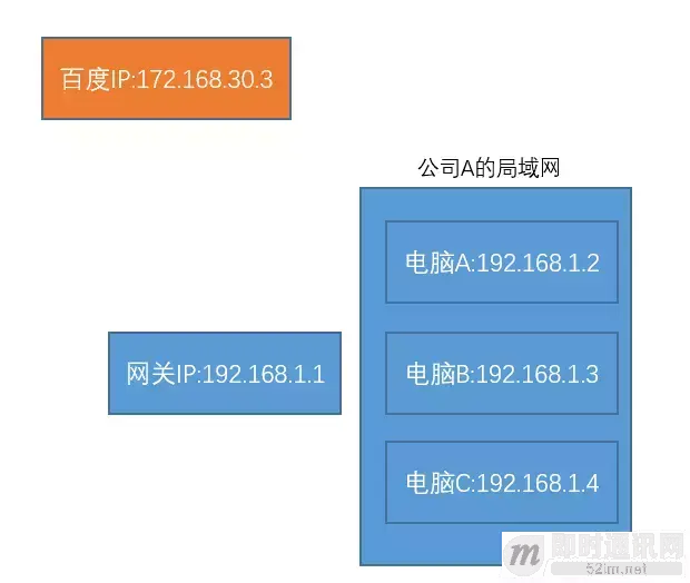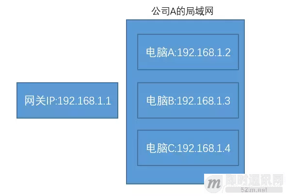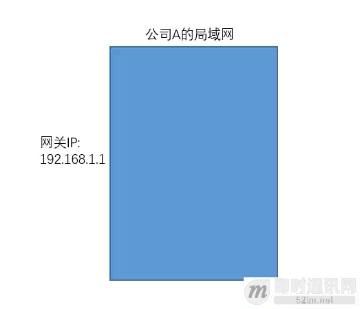 假如我们给这个公司A分配了一个IP=192.168.1.1。我们把这个IP作为这个公司内网的网关吧。