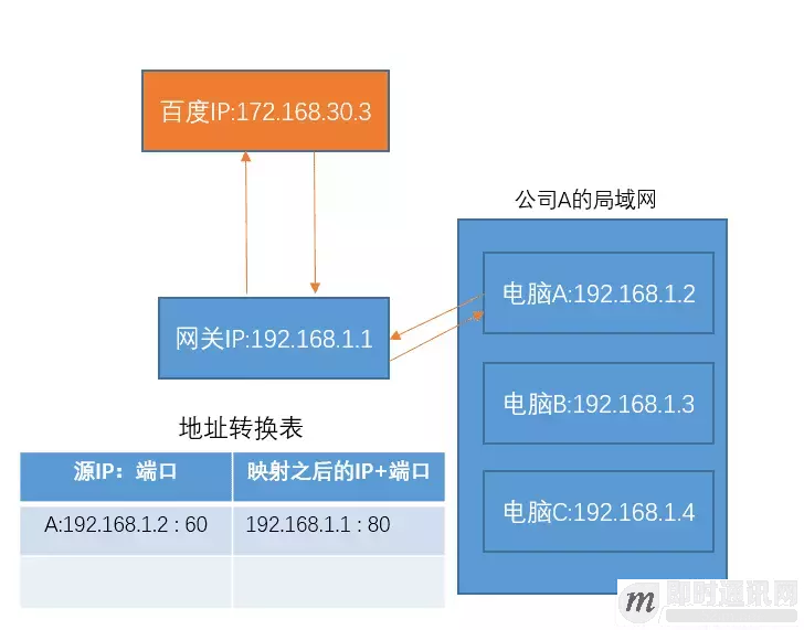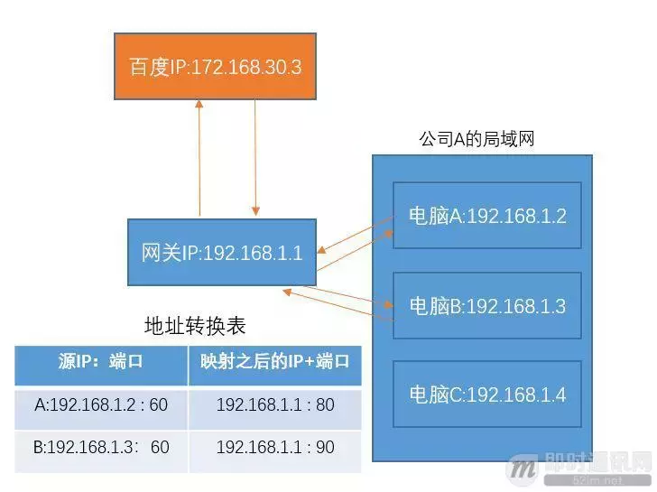 不过电脑A、B、C都可能拜托网关去帮忙访问百度,而百度返回的结果 的目的IP都是网关的IP=192.168.1.1。那么网关该如何进行区分这结果是A的、B的还是C的呢?