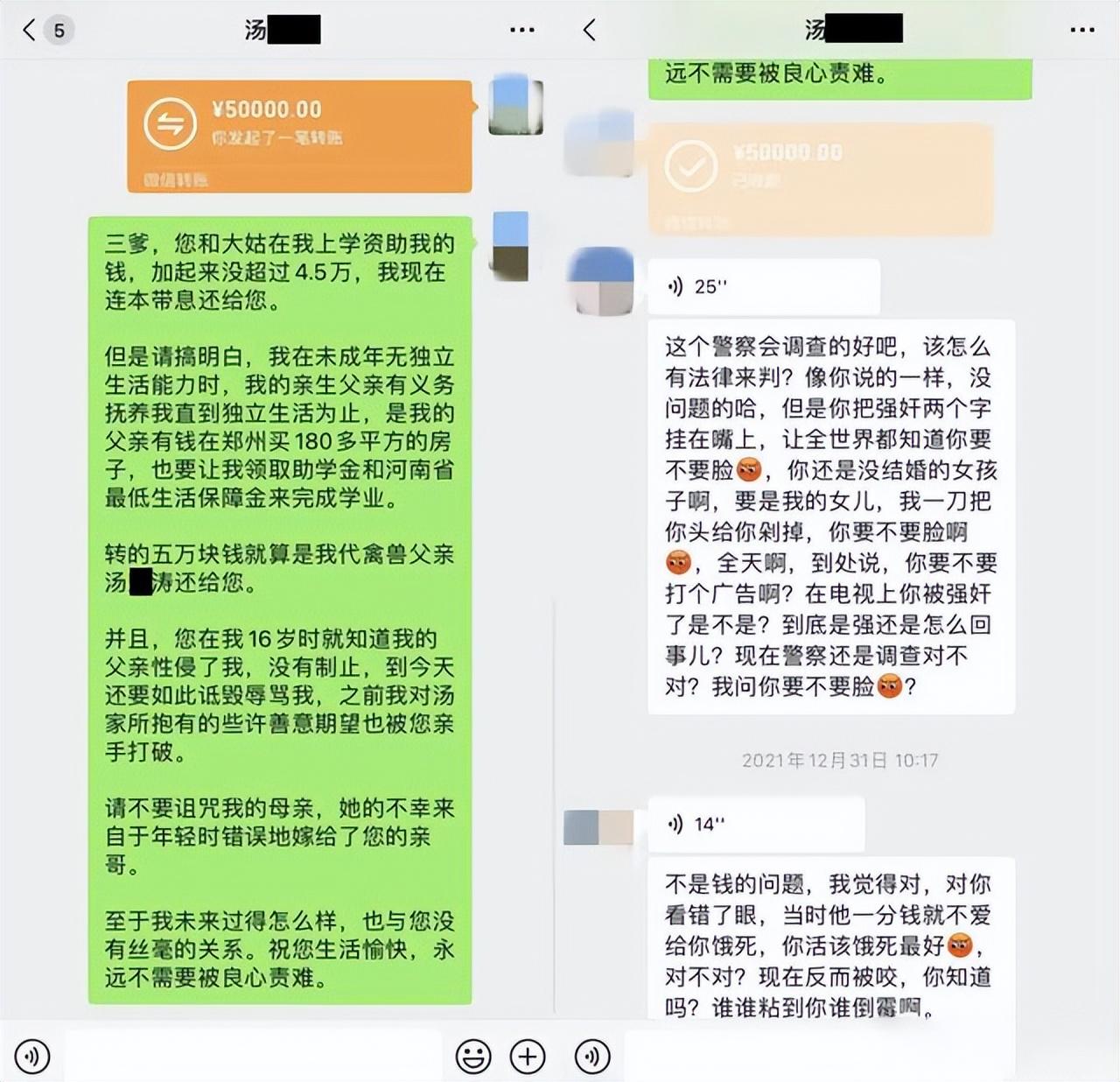 2021年12月27日,汤某涛到案并被刑拘,汤小甜将消息告诉了还有联系的二叔家妹妹,可她等来的是三叔的谩骂和要钱。